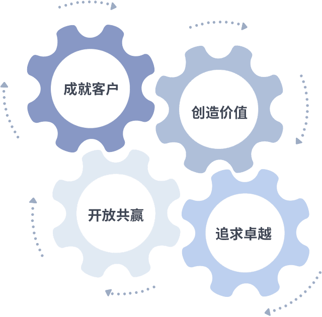 成就客户是一切决策的出发点,,创造价值是衡量所有工作的标准,,,,追求卓越是我们做事做人的态度,,开放共赢是我们的格局也是最终的结果。。。价值观的齿轮环环相扣,,,,推动着组织里的每个人不断向前。。。。